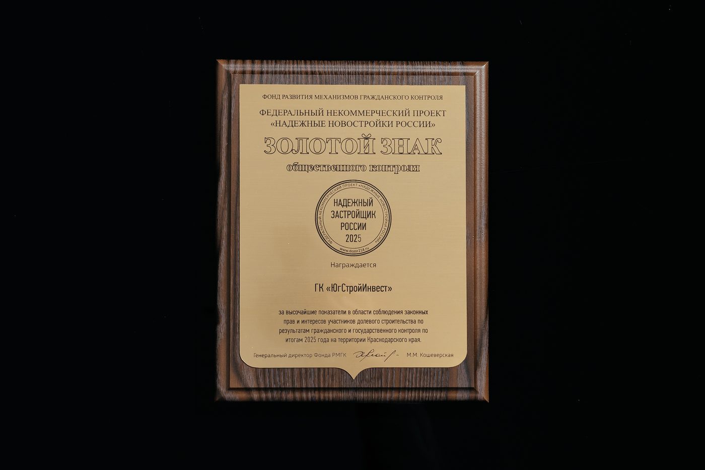 Золотой знак «Надежный застройщик» — это одна из самых авторитетных федеральных наград в сфере строительства, который присуждается по результатам независимой экспертной оценки. Его получение свидетельствует о финансовой прозрачности работы застройщика, своевременном выполнении обязательств перед дольщиками и высоком качестве возводимого жилья.